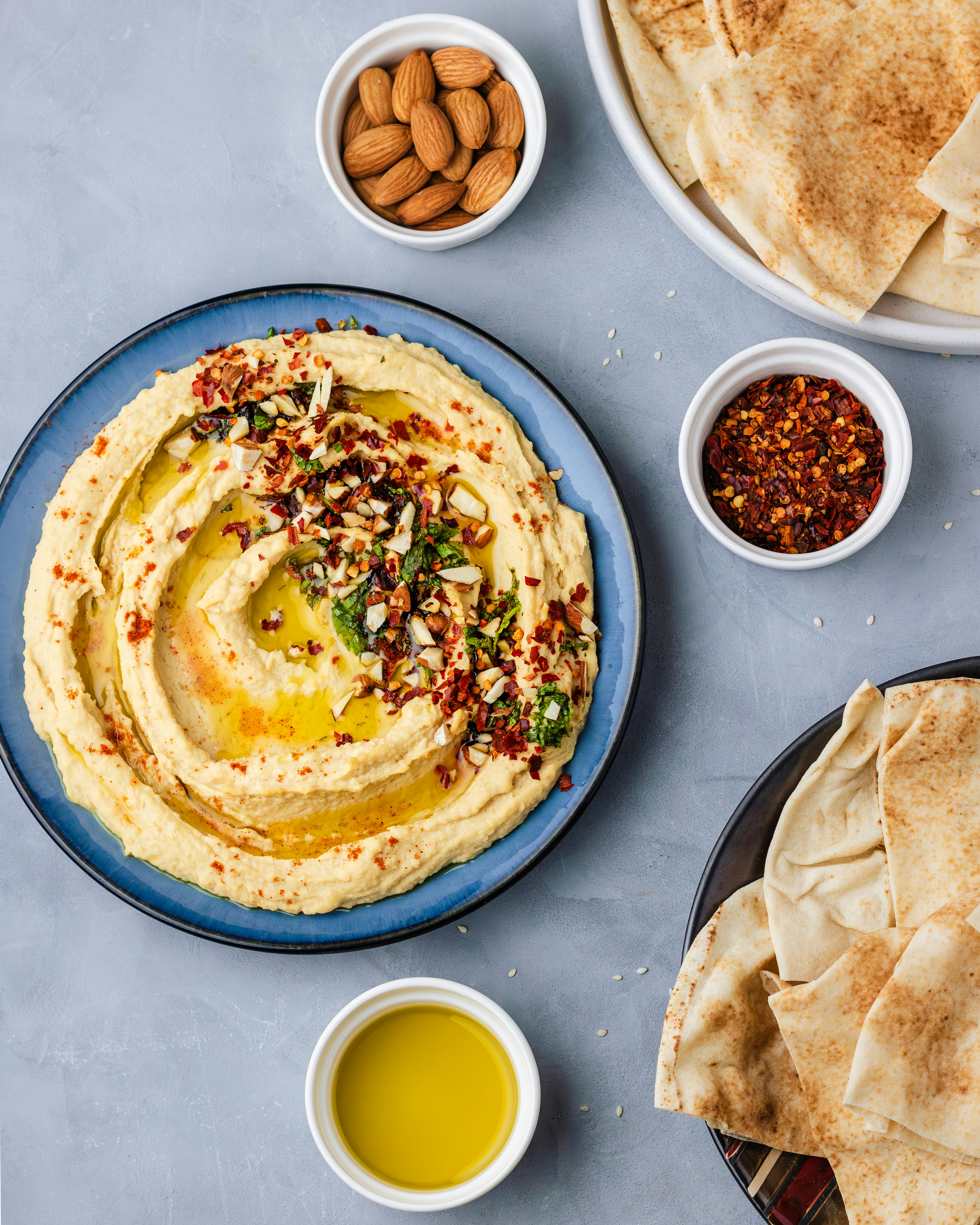 - Transfer the hummus to a serving bowl. Use the back of a spoon to swirl a shallow well in the center.